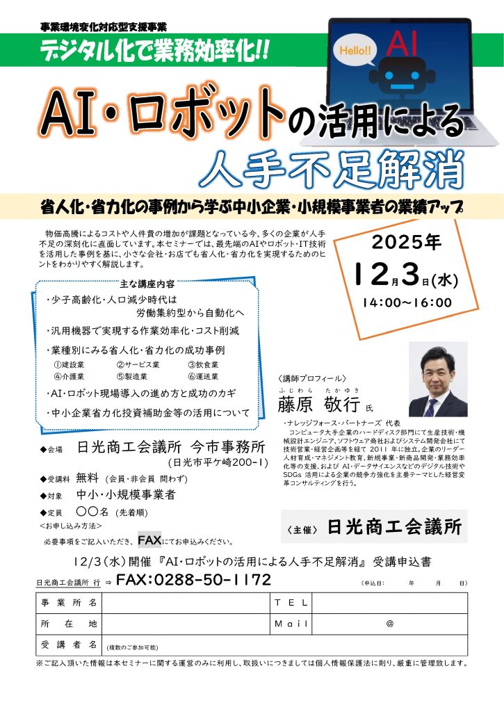 日光商工会議所の主催による生成AIをテーマにしたセミナーに、弊社代表が登壇いたします。
