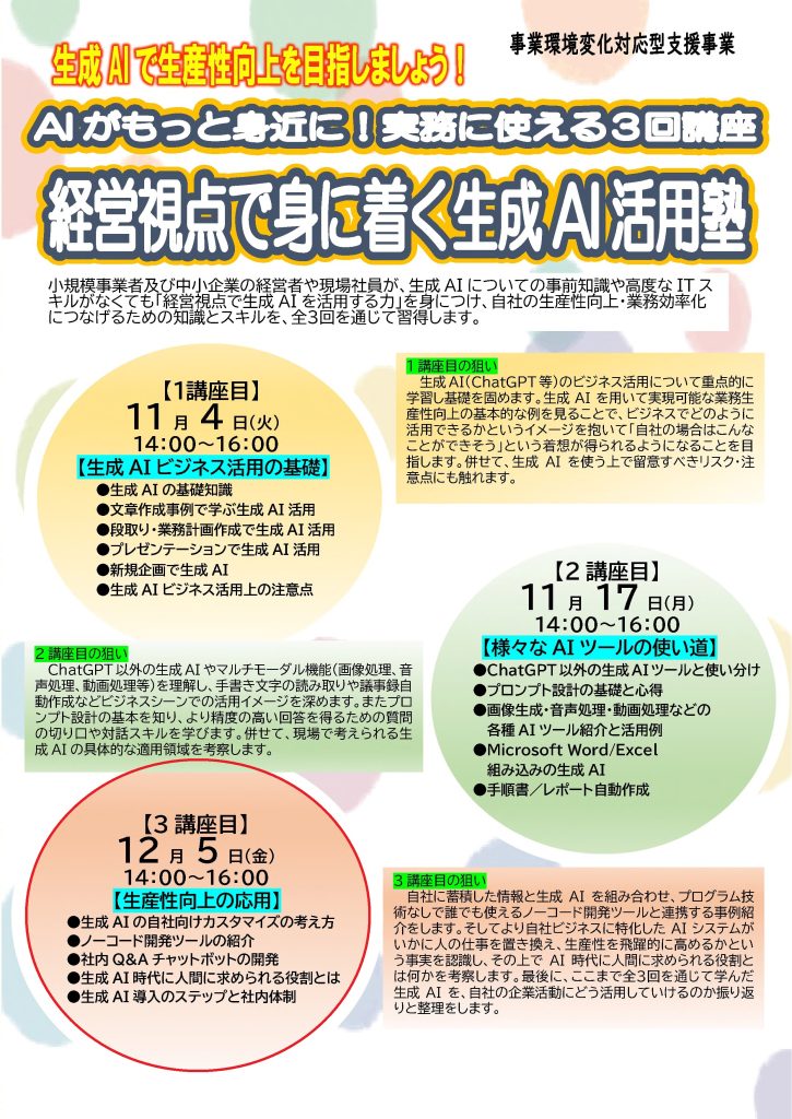中小企業・小規模事業者の経営者や現場社員を対象とした経営視点での生成AI活用3回講座の3回目で、自社向けの生成AIをノーコードで開発し運用することで組織にDXをもたらす方法についてわかりやすく解説します。