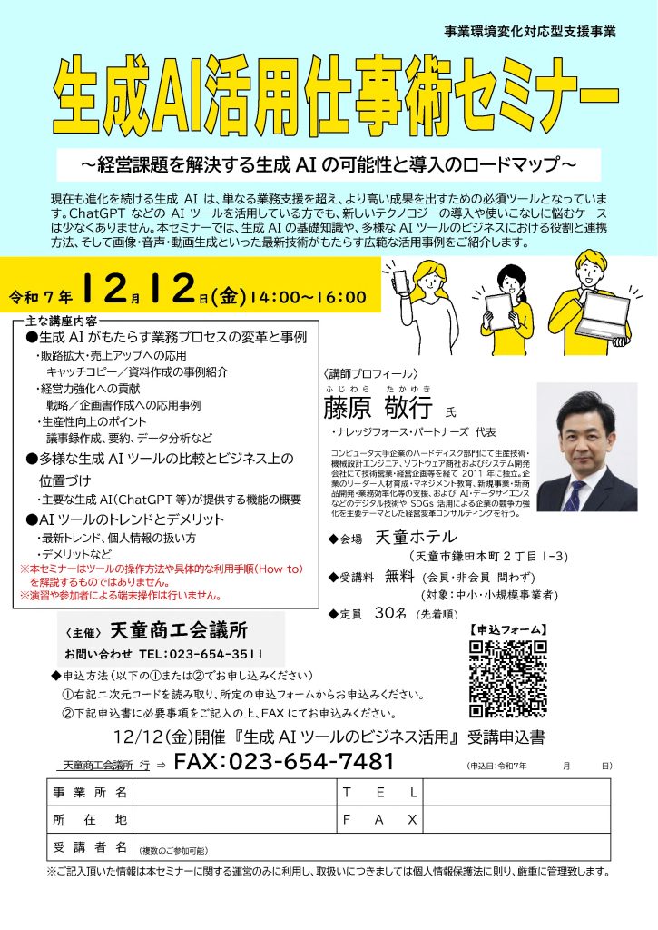 天童商工会議所の主催による生成AIをテーマにしたセミナーに、弊社代表が登壇いたします。